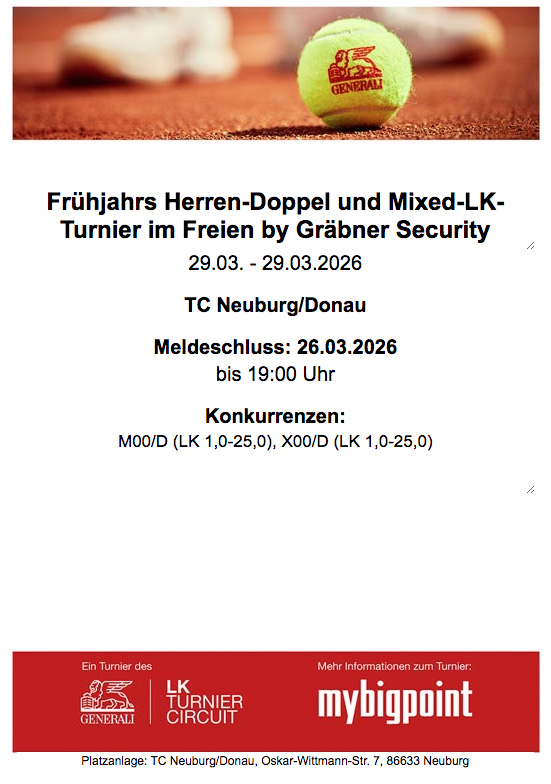die Hallensaison ist noch in den letzten Zügen, schon geht es mit voller Kraft in den Außenbereich. Am 29. März findet das Frühjahrs Herren-Doppel und Mixed-LK Turnier im Freien by Gräbner Security auf unseren Allwetter-Plätzen statt.