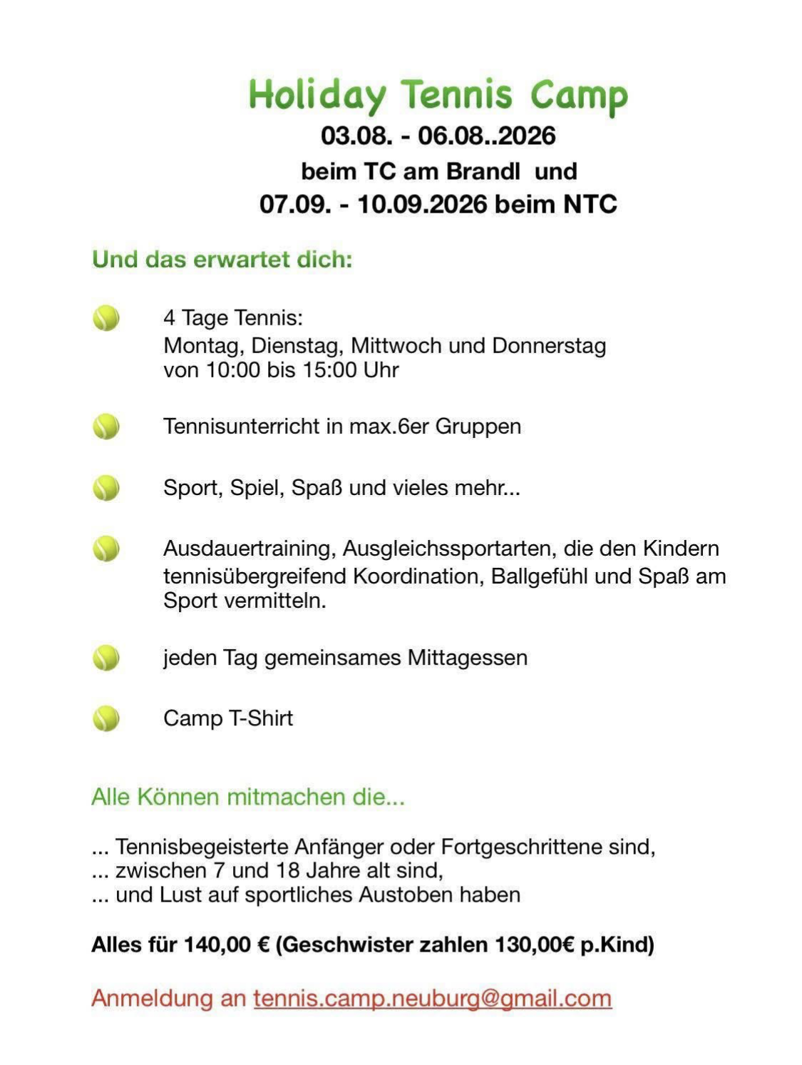Anmeldung per E-Mail über tennis.camp.neuburg@gmail.com möglich.