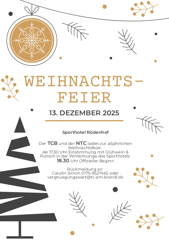 die Hallensaison ist schon voll im Gange, die ersten Schneeflocken sind schon auf den ersten Nasenspitzen, gleichzeitig laufen schon die Vorbereitungen für die gemeinsame Weihnachtsfeier des TC am Brandl und des Neuburger Tennisclubs am 13. Dezember 2025. Ab 17:30 Uhr findet eine Einstimmung mit Glühwein & Punch in der Winterlounge des Sporthotel Rödenhof statt, bevor es um 18:30 Uhr offiziell beginnt.